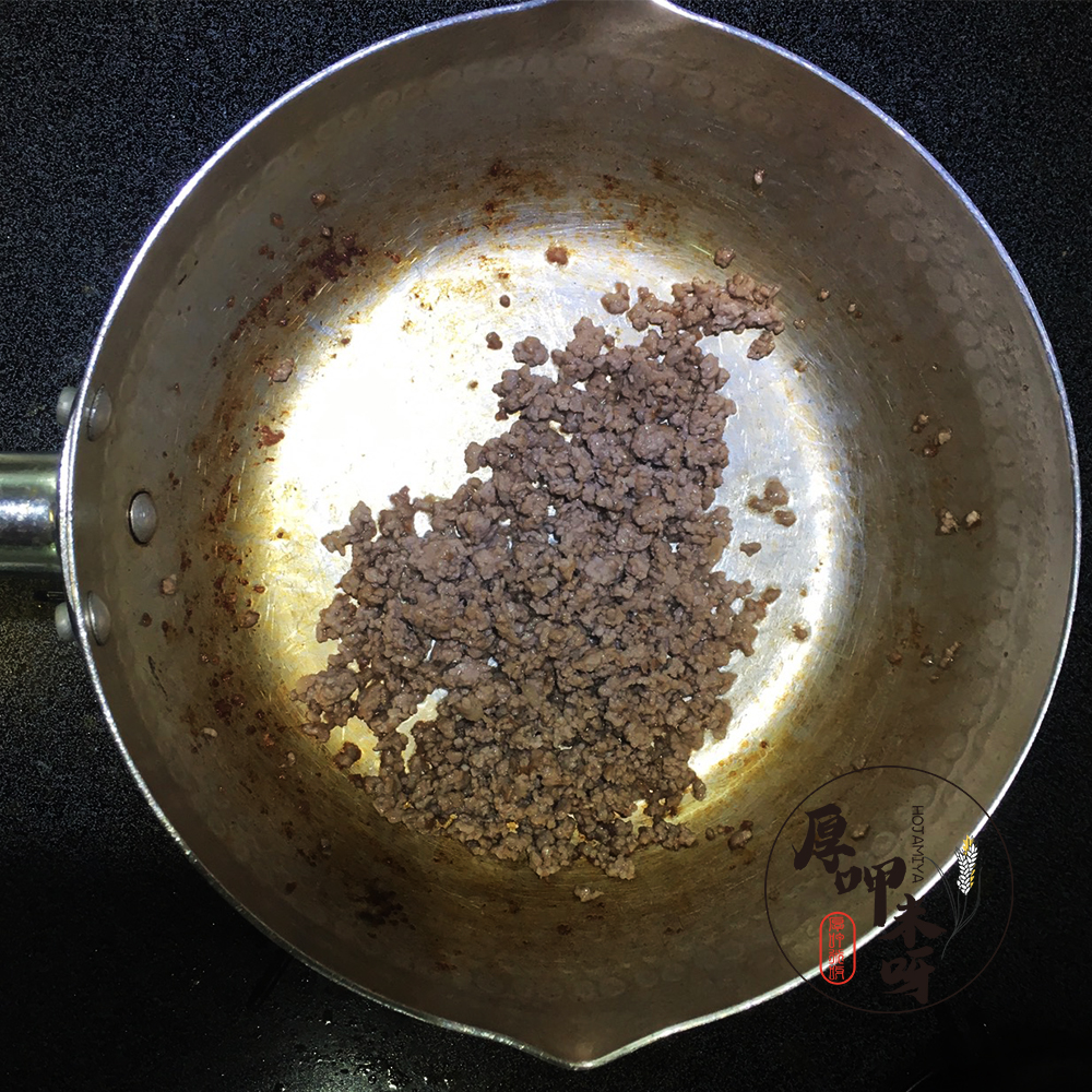 7. 重新添加植物油,熱油將牛肉末80克(或以豬肉代替)放入鍋中炒酥,撈起備用