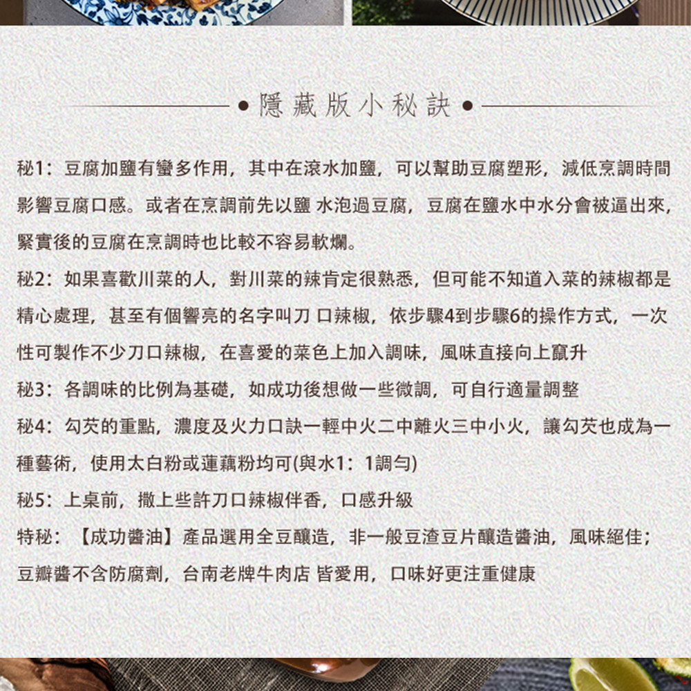 特秘:【成功醬油】產品選用全豆釀造,非一般豆渣豆片釀造醬油,風味絕佳;豆瓣醬不含防腐劑,台南老牌牛肉店皆愛用,口味好更注重健康