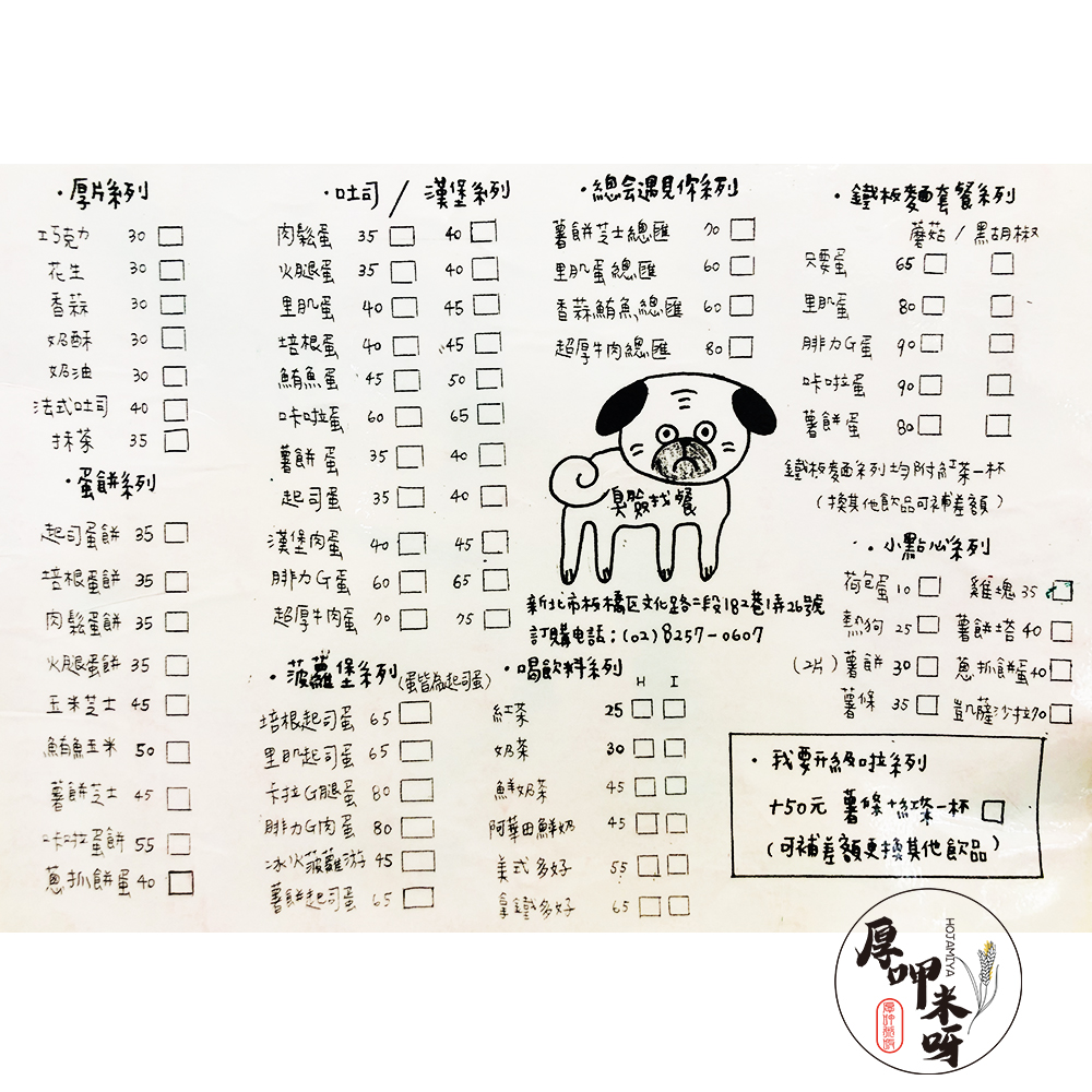 初訪這一天,點了店家招牌菠蘿包(內餡搭的是薯餅起司蛋),另外除了蔥抓餅加蛋,還點了鮪魚蛋吐司,附餐點了紅茶及鮮奶茶。看到這張菜單,感覺餐單的設計很單純,雖然以簡單的黑白色單色設計,但帶入手寫字及加入了店狗的圖案,在菜單上瀏覽了很久,最後才決定最後想吃的東西。